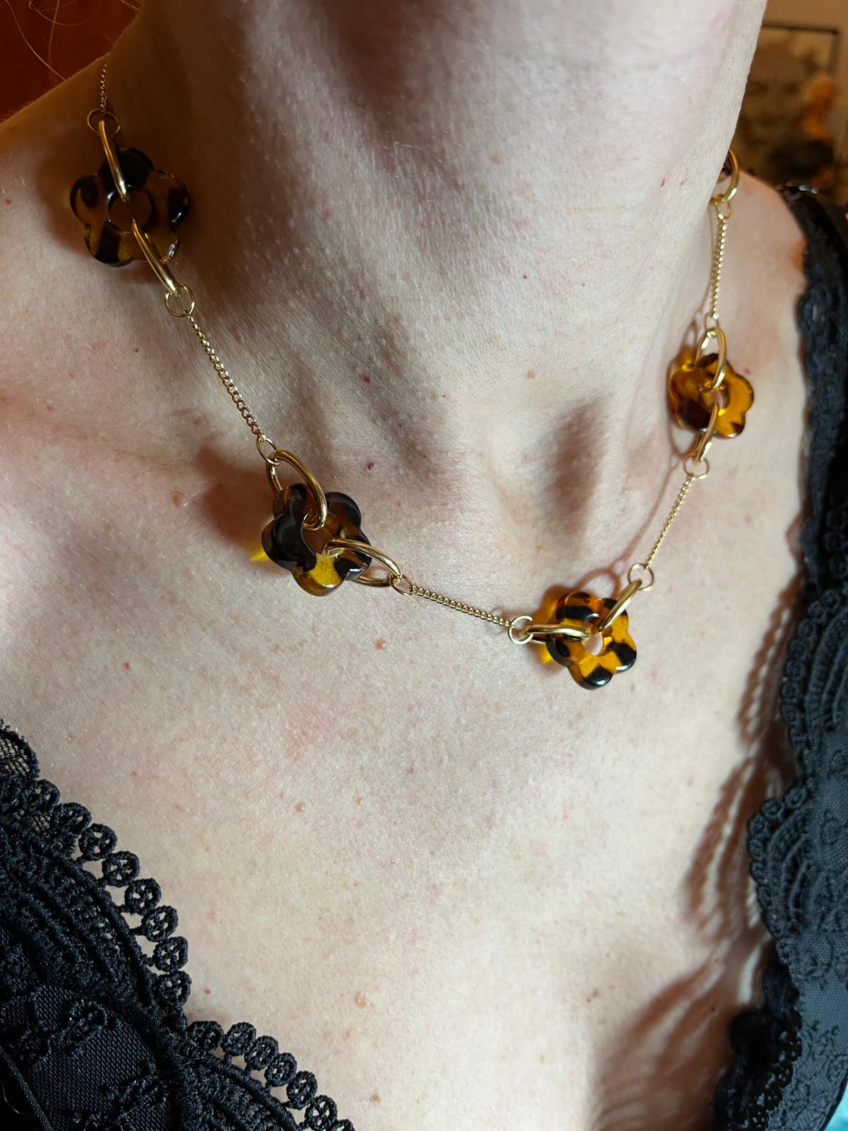 Collier sur chaîne en acier inoxydable composé de fleurs en résine, de chaînes et de maillons ovales.